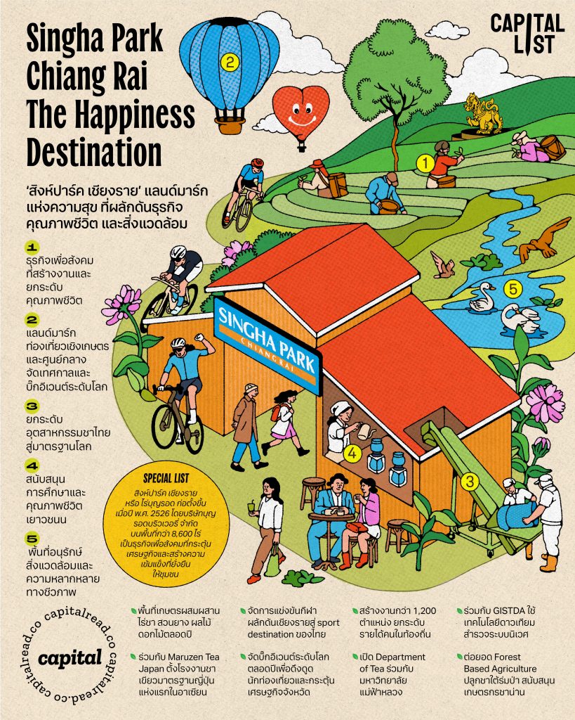 นอกจากนี้ สิงห์ปาร์ค เชียงรายยังทำหน้าที่เป็นศูนย์กลางจัดบิ๊กอีเวนต์ระดับประเทศและนานาชาติ ไม่ว่าจะเป็น Singha Park Chiangrai International Balloon Fiesta เทศกาลบอลลูนที่ใหญ่ที่สุดในอาเซียน ที่ล่าสุดเพิ่งได้รับรางวัล Gold Award ระดับโลกจาก IFEA (International Festivals & Events Association สมาคมเทศกาลและกิจกรรมระหว่างประเทศ ผู้มุ่งส่งเสริมและพัฒนางานเทศกาลและอีเวนต์ทั่วโลก) ซึ่งสะท้อนมาตรฐานการจัดงานระดับสากล ทั้งคุณภาพกิจกรรม การบริหารจัดการพื้นที่ ความปลอดภัย และการออกแบบประสบการณ์ผู้เข้าร่วมงานอย่างเป็นระบบ ไปจนถึงงาน Farm Festival on the Hill ที่จัดขึ้นเป็นประจำทุกปี