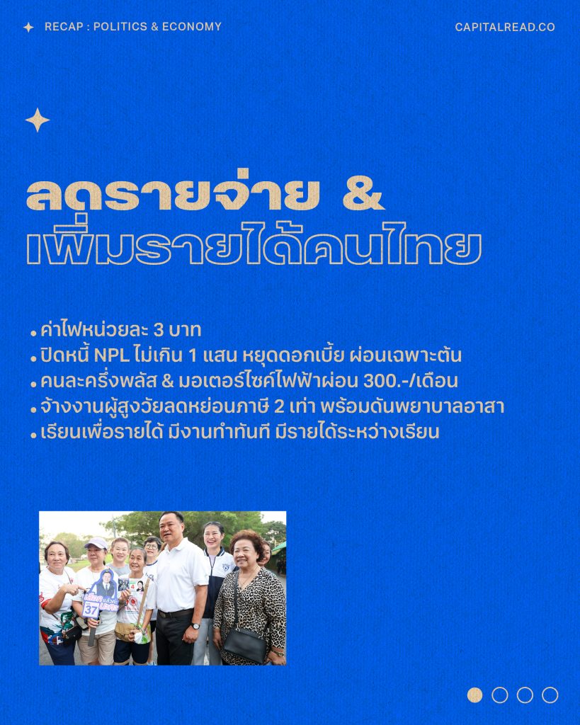 จะเห็นว่าในภาพรวม นโยบายเหล่านี้ทำให้เรื่องปากท้องของประชาชนและภาคธุรกิจเป็นรูปธรรม อย่างไรก็ตาม นโยบายหลายข้อยังอยู่ในระดับข้อเสนอและต้องแปลงเป็นมาตรการและงบประมาณจริง หากพรรคได้จัดตั้งรัฐบาล ซึ่งคงต้องติดตามผลการเลือกตั้งอย่างเป็นทางการอีกครั้ง และเช็กลิสต์นโยบายเหล่านี้ไปทีละข้อๆ ตลอดระยะเวลา 4 ปีที่กำลังจะเกิดขึ้นต่อจากนี้
