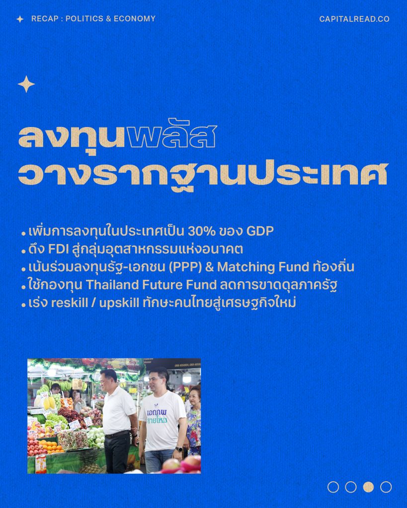 🤝 กลไกร่วมลงทุนใหม่ : เน้นรูปแบบ Public-Private Partnership (PPP), จัดตั้ง Matching Fund เพื่ออุดหนุนเงินท้องถิ่นร่วมลงทุน และใช้กองทุน Thailand Future Fund เพื่อลดการขาดดุลภาคภาครัฐ
