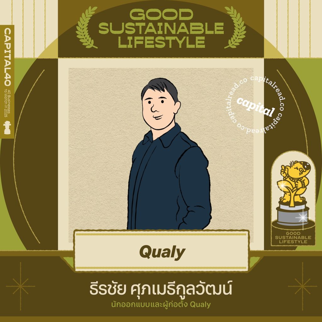 ตลอดปีที่ผ่านมา Qualy แบรนด์พลาสติกรักษ์โลกอายุ 20 ปี ของไจ๋–ธีรชัย ศุภเมธีกูลวัฒน์ ได้สร้างสรรค์คอลเลกชั่นรักษ์โลกที่ผลักดันผลกระทบต่อสังคมควบคู่กับการขับเคลื่อนด้านความยั่งยืน ตั้งแต่การสนับสนุน universal design สำหรับผู้พิการจากผลงาน Tactile Cube เกมรูบิกผิวสัมผัสแบบนูนพิเศษ, Land Game เกมจิ๊กซอว์พื้นผิว, Lensen ชุดอุปกรณ์วาดเขียนซึ่งถึงแม้จะมองไม่เห็นก็เล่นสนุกได้ และยังออกแบบสินค้าของใช้ดีไซน์ยั่งยืนจากแรงบันดาลใจในสัตว์ป่าสงวนและสัตว์ป่าคุ้มครองใกล้สูญพันธุ์ เช่น เต่ามะเฟือง ฉลามวาฬ วาฬสีน้ำเงิน เพื่อสร้างการตระหนักรู้ในการอนุรักษ์, พัฒนา ‘หุ่นชีวิน’ ชุดอุปกรณ์ฝึกสอน CPR ที่มีราคาสูงและขาดแคลนในตลาดเพื่อส่งเสริมทักษะการรับมือกับเหตุการณ์ฉุกเฉิน, ริเริ่มไอเดีย ‘กระทงวันเพ็ญ’ ที่มาพร้อมโมเดลวนใช้ซ้ำได้ในวันลอยกระทงและอีกมากมาย แน่นอนว่าทั้งหมดนี้แบรนด์ใช้วัสดุรีไซเคิลจากขยะเป็นหลักในการออกแบบผลิตภัณฑ์ และยังพัฒนาสื่อการเรียนรู้ ‘Waste War บอร์ดเกมแยกขยะ’ ร่วมกับอินฟลูเอนเซอร์สายสิ่งแวดล้อม Konggreengreen ที่ทำให้ความรู้ในการแยกขยะเป็นเรื่องสนุก เป็นตัวอย่างของแบรนด์ที่นำเสนอแนวคิดด้านสิ่งแวดล้อมได้อย่างน่าชื่นชม