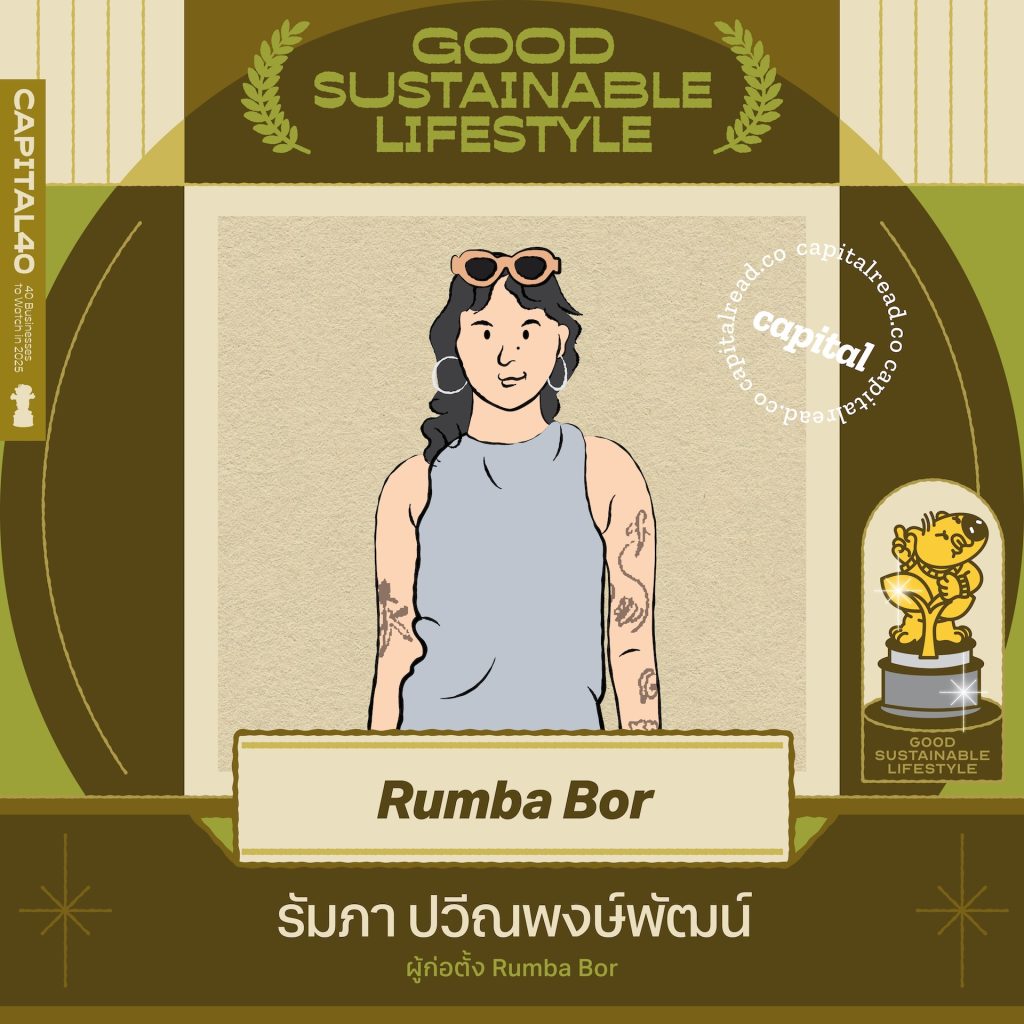 Rumba Bor เป็นแบรนด์ดีไซน์ของ รัมภา ปวีณพงษ์พัฒน์ ที่หยิบสารพัดของแมสที่หลายคนอาจมองว่าเช้ยเชยมาพลิกแพลงให้ร่วมสมัย สินค้าเด่นของแบรนด์อย่าง ‘เก้าอี้เฌย’ ไม่เพียงแค่ปัดฝุ่นเก้าอี้จีนวัสดุ PVC ให้มีเฉดสีสะดุดตาพร้อมลวดลายสะดุดใจมากขึ้น แต่ยังทำจากเม็ดพลาสติกรีไซเคิล เช่น พอลิเอทิลีน ส่วน ‘เฌิง’ ก็เกิดจากลูกกรงเซรามิกสไตล์โรมันที่ค้างสต็อก นำมาสะบัดความเชยให้ชิคขึ้นด้วยการต่อกับฐานสเตนเลสสตีลลายดอกไม้กลายเป็นของตกแต่งบ้านดีไซน์ไฉไล นอกจากการใช้พลาสติกรีไซเคิลในการสร้างสรรค์ผลงานดีไซน์จะช่วยลดการใช้ PVC ที่รีไซเคิลยากแล้ว กระบวนการฉีดพลาสติกของแบรนด์ยังทำให้เกิดเฉดสีพิเศษไม่เหมือนใครที่นำมาตั้งชื่อสไตล์ไทยๆ อย่างมีจริต เช่น คอลเลกชั่นรวมมิตรที่มีสีเขียวใบเตย สีฟ้าอัญชัน สีน้ำตาลซาสี่ สีเขียวขาวตะโก้ ฯลฯ กลายเป็นการปัดฝุ่นสิ่งของที่หลายคนมองว่าเชยให้กลายเป็นของตกแต่งบ้านสุดชิคที่เป็นมิตรต่อสิ่งแวดล้อมด้วย