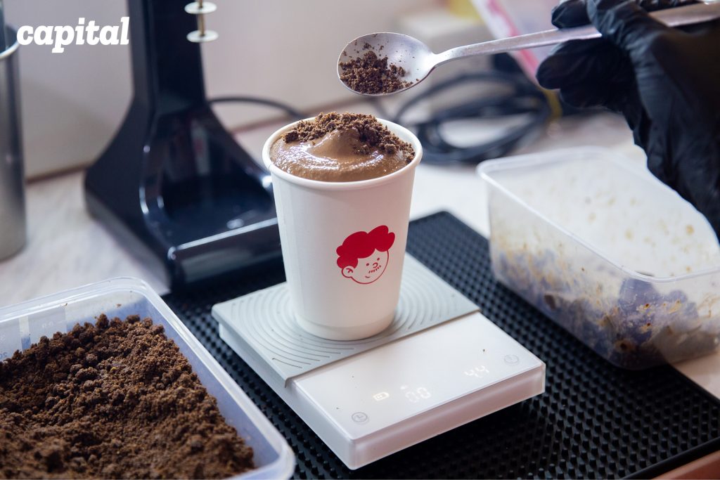 “สลัชชี่เนี่ย จริงๆ ผม 3 คนไม่ชอบทานปั่นเลย ตอนทำก็เลยทำโดยการที่กะๆ เอาว่าคงประมาณนี้แหละ แล้วก็ต้องทำ sample taste เพราะว่าเมนูส่วนใหญ่ที่ร้านพวกเราจะ R&D กันเอง แต่สลัชชี่เป็นการเดาเลยเพราะว่าปกติไม่ทาน ก็เลยลองแจกชิมเยอะมาก” ส่วนช็อกโกแลต ทางร้านใช้ช็อกโกแลตจากจังหวัดกำแพงเพชรซึ่งเป็นที่ตั้งของสวนของไอ และมีช็อกโกแลตจากจังหวัดตากเป็นอีกหนึ่งตัวเลือก ทั้ง 2 แหล่งให้รสชาติที่มีเอกลักษณ์ต่างกัน