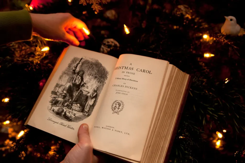 นอกจากบริบทอันซับซ้อนของยุครอยต่อซึ่งเป็นทั้งการรื้อฟื้นธรรมเนียมการเล่าเรื่องผีในช่วงฤดูหนาว การมาถึงของตลาดสิ่งพิมพ์ หนังสือสำคัญที่ทำให้เรื่องผีกลายเป็นหัวใจของวันคริสต์มาสคือนิยายขนาดสั้นเรื่อง A Christmas Carol ของชาร์ลส์ ดิกคินส์ งานเขียนที่ทั้งสะท้อนกิจกรรมการจับจ่ายในช่วงเทศกาลและการที่ตัวหนังสือกลายเป็นสินค้าที่ถูกออกแบบให้เป็นของขวัญ