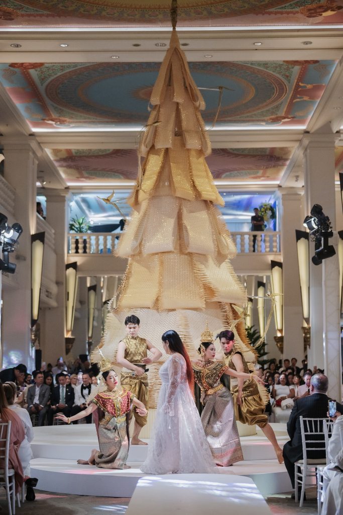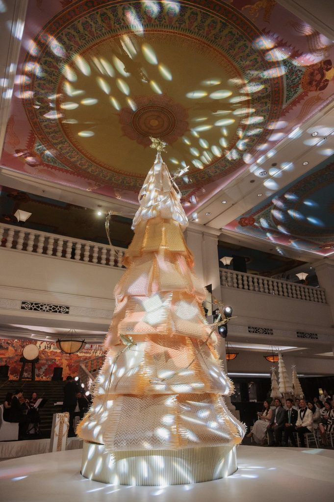 ‘ต้นคริสต์มาสแห่งกาลเวลา’ (Heritage Tree Lighting) ที่โถงล็อบบี้ ด้านหน้าของโรงแรมอนันตรา สยาม กรุงเทพฯ ในปีนี้เกิดจากการออกแบบร่วมกับแบรนด์ INTHAI Studio กลุ่มศิลปินไทยที่มีผลงานโดดเด่นด้านงานหัตถศิลป์ไทย นำโดย ‘มายด์–อารียา บุญช่วยแล้ว’ ดีไซเนอร์ของแบรนด์
