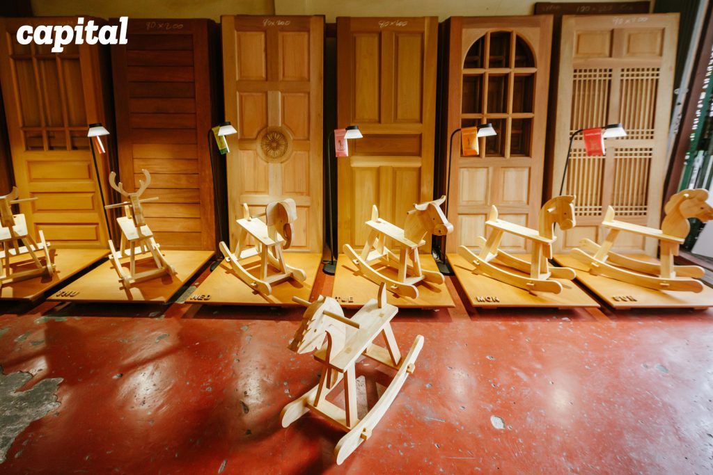 ปรัชญ์เล่าว่า ‘แม่ซื้อไม้โยกเยก’ เกิดจากโจทย์ที่ตั้งไว้กับทีมดีไซเนอร์ในออฟฟิศให้คอยเก็บแรงบันดาลใจหรือไอเดียที่เกี่ยวข้องกับวัฒนธรรมใส่แฟ้มสะสมไว้ เผื่อว่าวันหนึ่งจะมีโอกาสหยิบเทคนิคของช่างไม้ไทยดั้งเดิมมาต่อยอดเป็นสินค้าใหม่นอกเหนือจากประตูและหน้าต่าง จนกระทั่งสังเกตเห็นประเด็นหนึ่งในแฟ้มที่น่าสนใจและอยากหยิบมาเล่าต่อคือม้าไม้