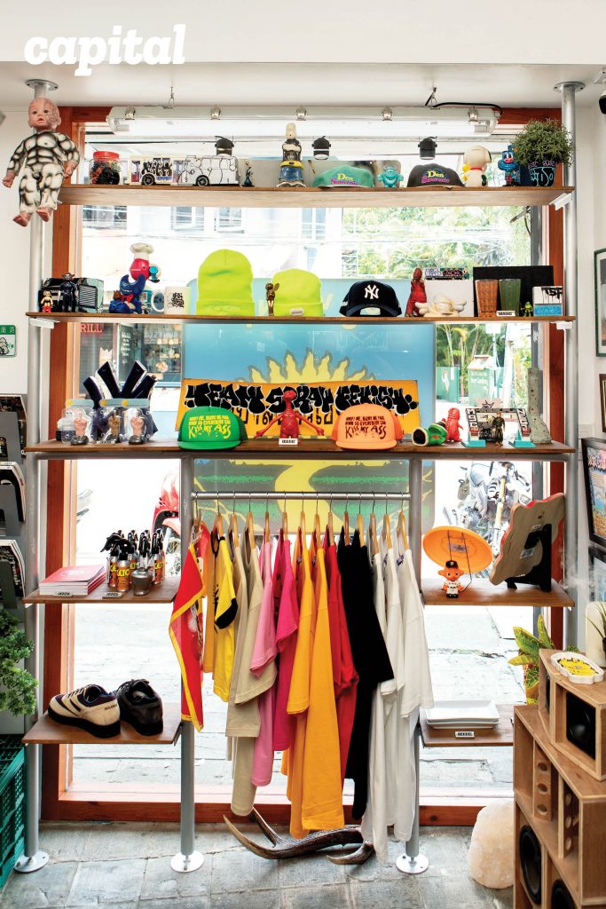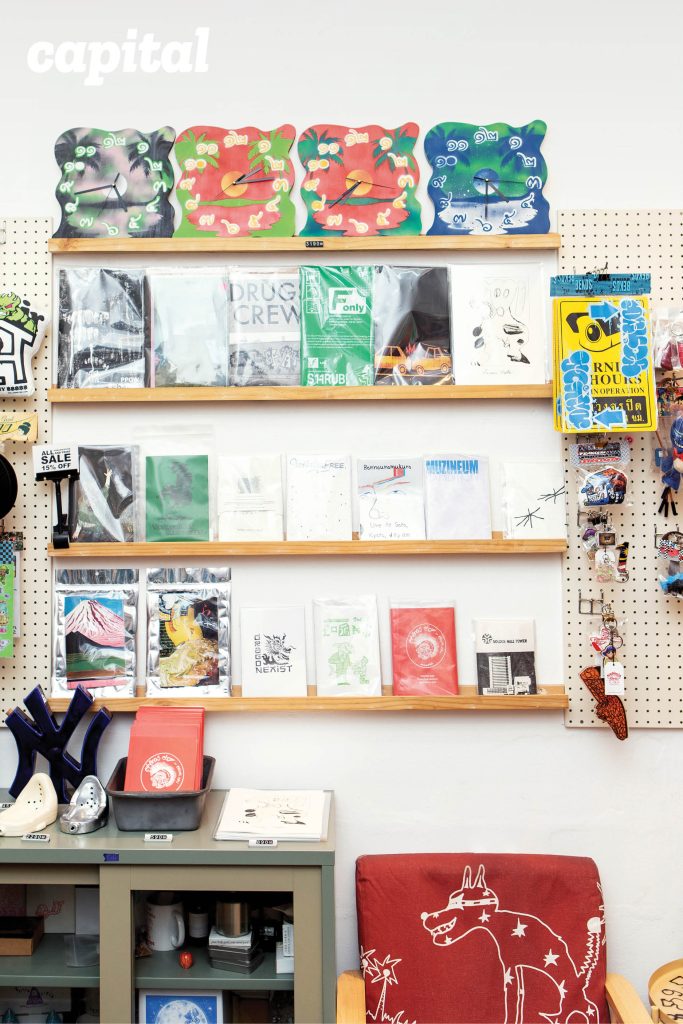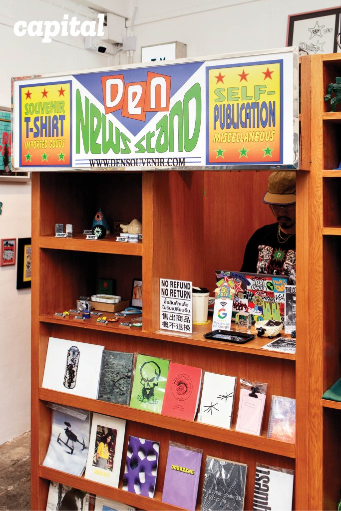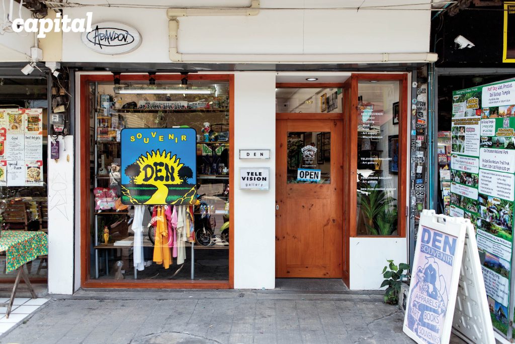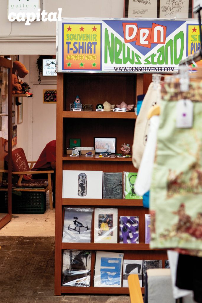 ด้านหน้าร้าน DEN ดูแตกต่างแต่กลมกลืนไปกับชุมชนรอบข้าง ส่วนภายในร้านตึกแถวสองชั้นแห่งนี้ บริเวณชั้นล่างที่เป็นช็อปเต็มไปด้วยสารพัดสิ่งของ ทั้งเสื้อผ้า เครื่องแต่งกาย เครื่องประดับ ดิจิทัลพรินต์ zine หรือหนังสือทำมือ งานเซรามิก งานศิลปะ ของที่ระลึก และของจุกจิกเท่ๆ มากมาย