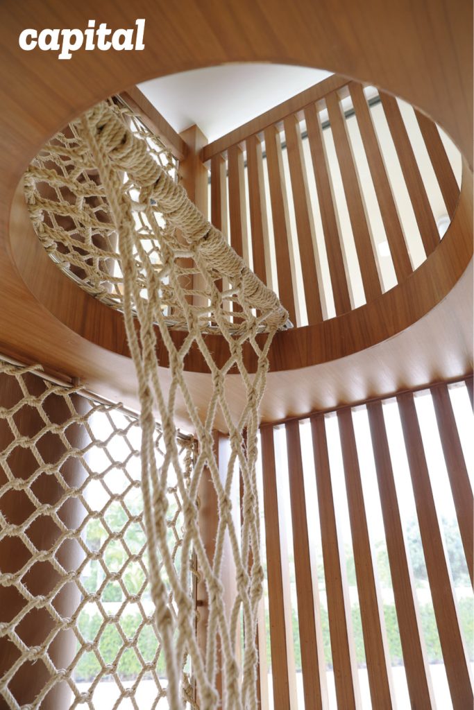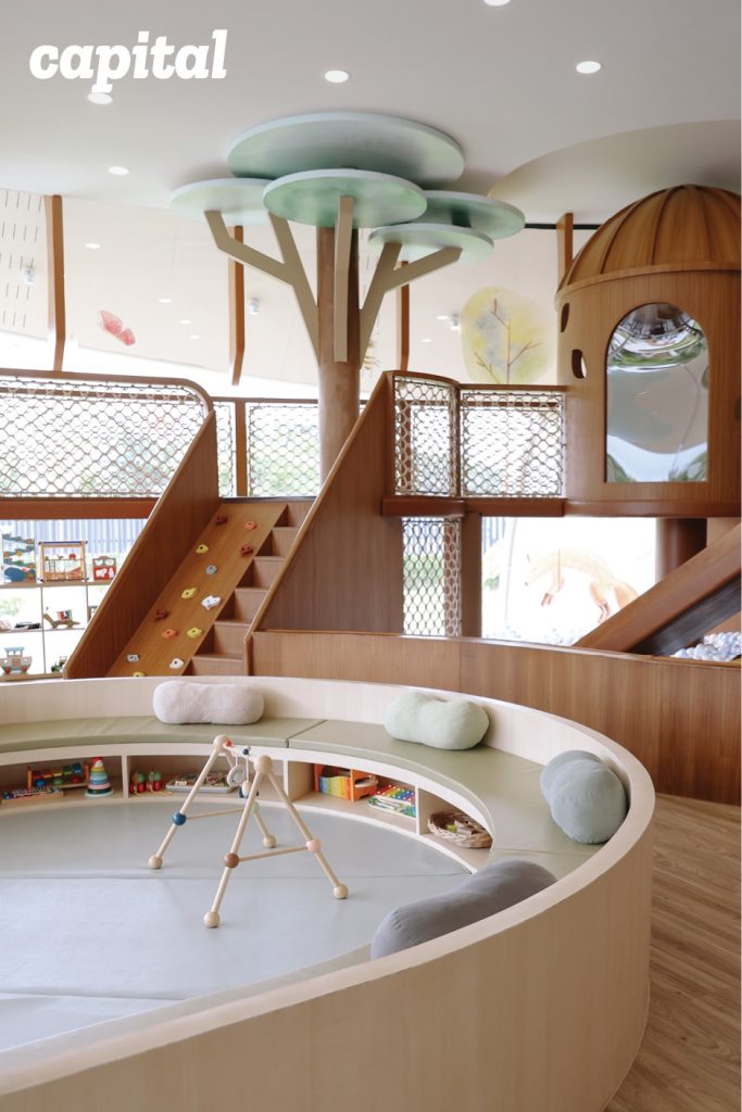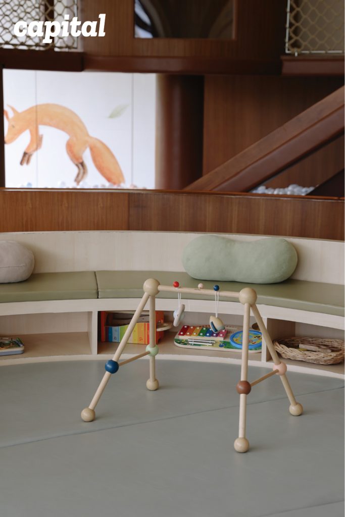 “อย่างเรื่องของการเลือกสีของไม้สำคัญมาก เพราะเราอยากให้คนที่เข้ามารู้สึกถึงบรรยากาศอบอุ่น” วรมนอธิบายเสริม “ยกตัวอย่างพื้นที่ตรงกลางร้านเราเลือกใช้ไม้สีอ่อน มีบุนวมกันกระแทก มีความโค้งโอบรับ เพราะเราอยากให้พื้นที่ตรงนี้เป็นพื้นที่ที่เหมาะสำหรับเด็กเล็ก 2-3 ขวบ”