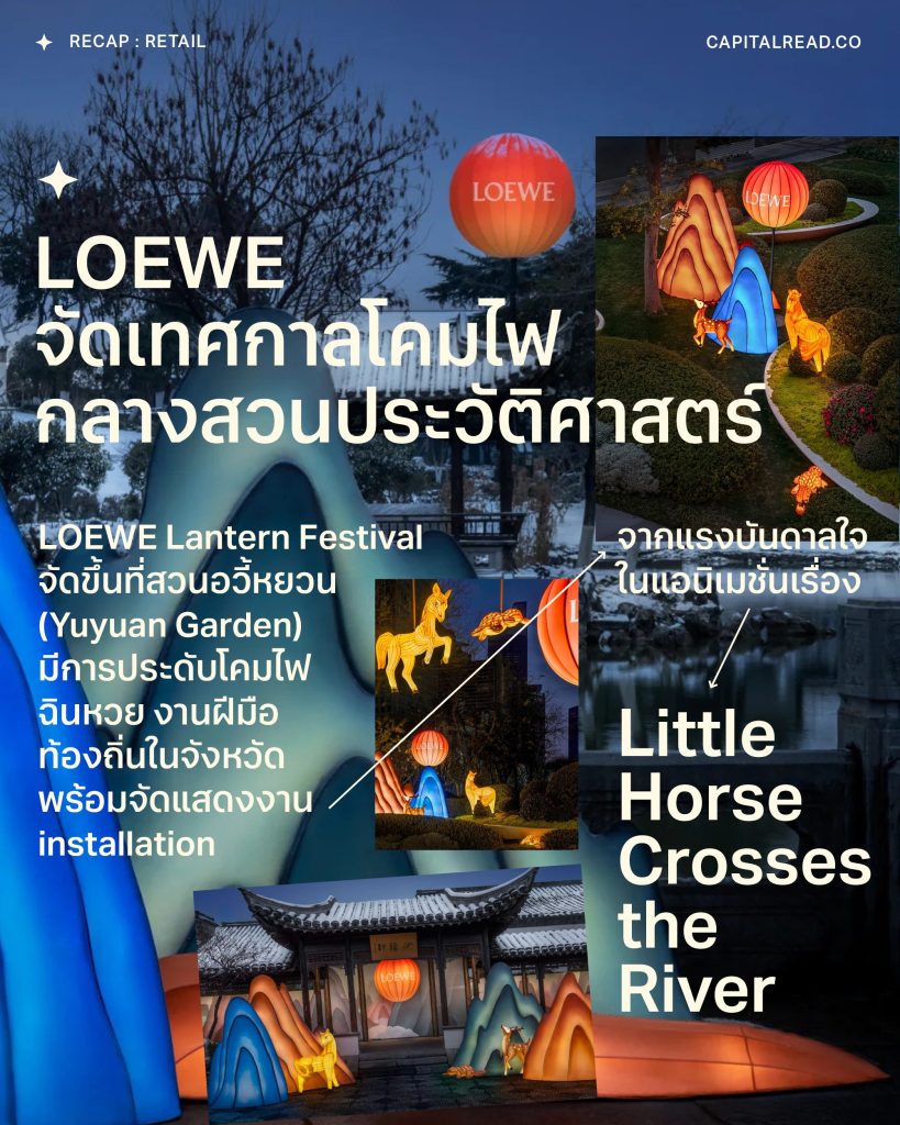 LOEWE เป็นแบรนด์ที่ขึ้นชื่อด้านการให้ความสำคัญกับงานฝีมืออยู่แล้ว แคมเปญตรุษจีนในปีนี้ตั้งใจสื่อสารตัวตนของแบรนด์ที่ให้ความสำคัญกับวัฒนธรรมด้วยการจัด ‘เทศกาลโคมไฟ’ ที่สวนอวี้หยวน (Yuyuan Garden) ซึ่งเป็นสวนแห่งประวัติศาสตร์ในเมืองหนานจิงอายุ 400 กว่าปี โดยประดับโคมไฟฉินหวย งานฝีมือท้องถิ่น ซึ่งในหนานจิงจะนิยมจัดเทศกาลโคมไฟนี้อย่างอลังการในช่วงตรุษจีนอยู่แล้ว