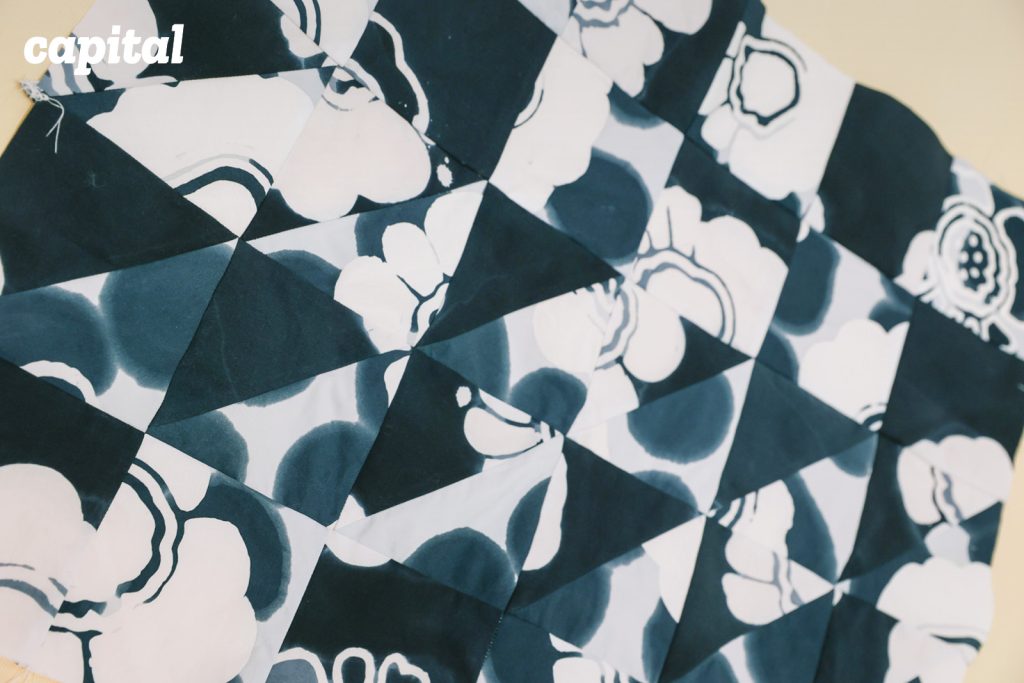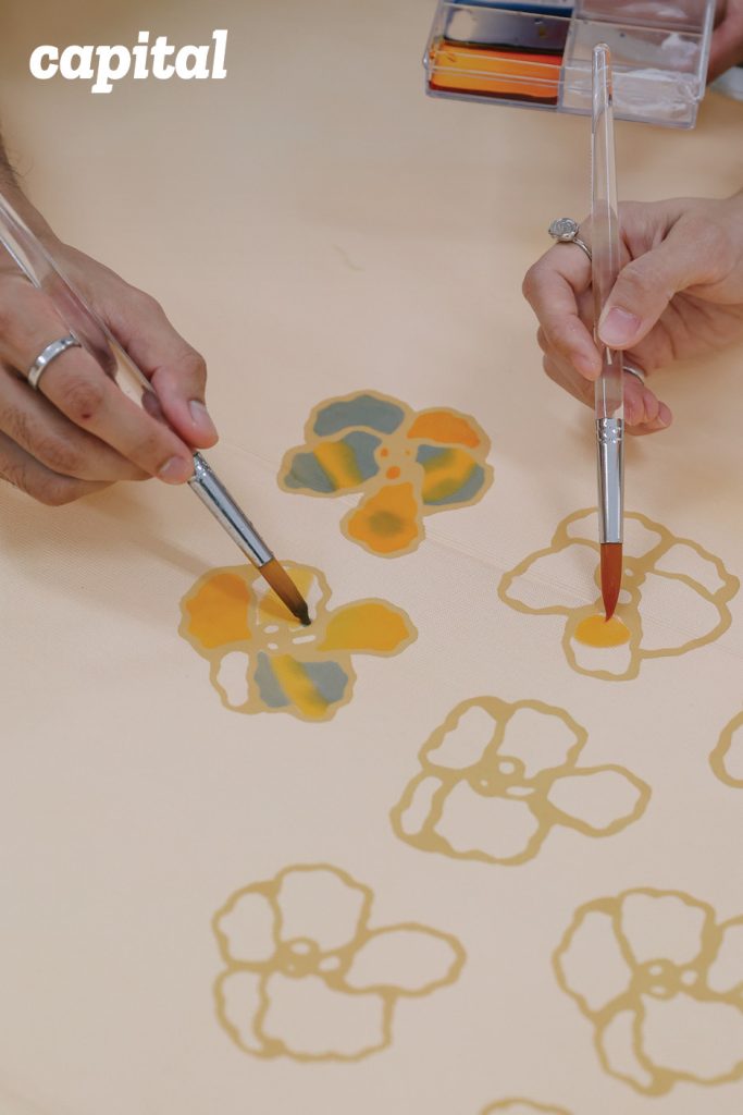 “กระบวนการคือ เราจะเตรียมการวาดลายคร่าวๆ มาก่อนในกระดาษ และออกแบบมู้ด โทนสีไว้ แต่เวลาที่ทำจริงๆ มันจะเป็นไปตามฟีลลิ่งทั้งหมด ไม่ว่าจะทำแบบในคอมพ์มาก่อนหรือวาดแบบในกระดาษ สุดท้ายแล้วยังไงเราก็ต้องมาทดลองกับผ้าทั้งหมดอยู่ดี เพราะความพิเศษของผ้าแต่ละชนิดส่งผลให้เอฟเฟกต์ที่ออกมาไม่เหมือนกัน ซึ่งเป็นส่วนที่เราไม่สามารถออกแบบมาก่อนได้ในคอมพ์ มันไม่สามารถบอกได้ว่าผ้าแบบนี้ ทำออกมาแล้วจะเป็นแบบที่เราอยากให้เป็นหรือเปล่า”