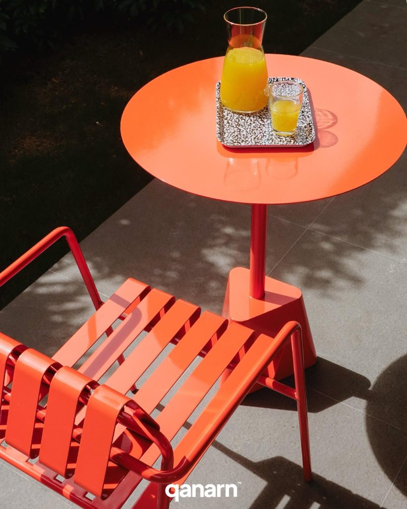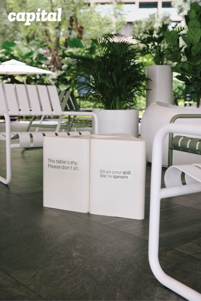นี่คือข้อความขี้เล่นที่สกรีนอยู่บนโต๊ะเตี้ยทรงสามเหลี่ยมของแบรนด์ Qanarn ซึ่งตั้งเป็นเซตคู่กับเก้าอี้เอาต์ดอร์ ที่โดดเด่นด้วยเส้นสายเรขาคณิตเฉียบคม ข้อความเหล่านี้ไม่ได้มีไว้แค่เรียกรอยยิ้ม แต่ยังทำหน้าที่เตือนให้รู้ว่า “นี่ไม่ใช่เก้าอี้นะ” เพราะด้วยความเตี้ยและรูปทรงที่เรียบง่าย ทำให้หลายคนเผลอนั่งไปโดยไม่รู้ตัว