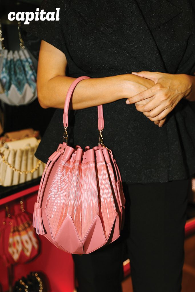 “เราพยายามแก้ pain point ของการใช้ผ้าไหมทีละจุด อย่างกระเป๋า ‘ParnPum (พานพุ่ม)’ นี้ เกิดจากเดิมทีหลายคนมองว่ากระเป๋าผ้าไหมดูแก่ เราเลยออกแบบให้เป็นทรงที่มีความโมเดิร์นขึ้น แรงบันดาลใจมาจากพานพุ่มดอกไม้แบบไทยๆ ซึ่งปกติเราคุ้นเคยกับทรงนี้และกลีบดอกไม้ที่ฐาน เรานำ shape & form เดิมมาเรียบเรียงใหม่ให้เรียบง่ายขึ้น ใช้งานได้ง่ายขึ้น ปรับฐานให้มีความ geometric และผสมผสานกับผ้าไหม กลายเป็นดีไซน์ที่มีความคมของเหลี่ยมมุมแต่ก็ยังคงความนุ่มนวลของผ้าไหม รุ่นนี้เลยมีความคอนทราสต์ในตัวเอง และเป็นทรงที่ยังไม่มีใครทำมาก่อน ลูกค้าเห็นแล้วมักจะพูดว่า แปลกดี ไม่เคยเห็นมาก่อน”