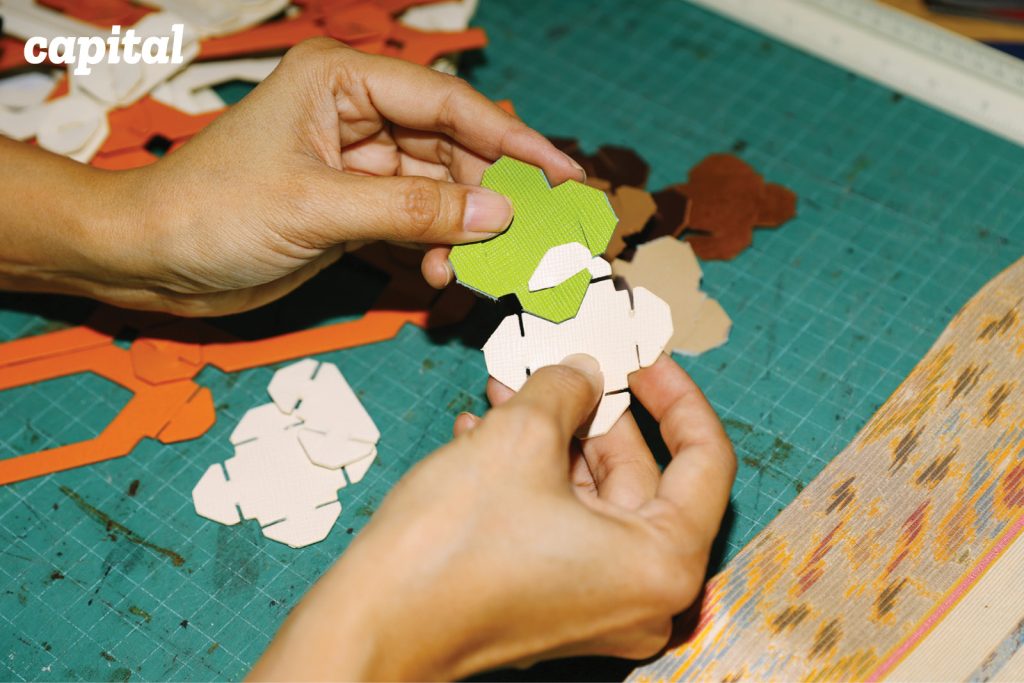 “เวลาที่เศษผ้าหลือเป็นชิ้นเล็กๆ จนมันไม่สามารถทําอะไรได้เลย เราก็เอาเศษเล็กๆ มาต่อกัน เรียกว่า Modular Technique แล้วก็เอามาสานกันเพื่อเพิ่มความแข็งแรง มันต้องใช้ทฤษฎีสีนิดหน่อย เพื่อทําออกมาแล้วเป็นโทนสีที่ใช้งานง่ายในชีวิตประจําวันได้ แมตช์เสื้อผ้าง่าย ปกติหนังจะทํามาหลายสีอยู่แล้วและเศษหนังในโรงงานก็มีสีเยอะ ซึ่งตอนนี้เราจองเศษหนังในโรงงานหมดแล้ว