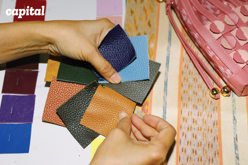 ด้วยความที่การตัดกระเป๋ามักมีเศษผ้าไหมเหลือเสมอ นงนุชจึงตามหาเศษหนังเหลือจากโรงงานที่มีโทนสีเข้ากับเศษผ้า จากเศษวัสดุซึ่งมีที่มาจากคนละทิศละทาง เมื่อจับมาแมตช์กันด้วยสายตาของดีไซเนอร์ก็ออกมาเข้าคู่เป็นพาเลตต์เดียวกัน สวยราวเกิดมาเพื่อกันและกัน