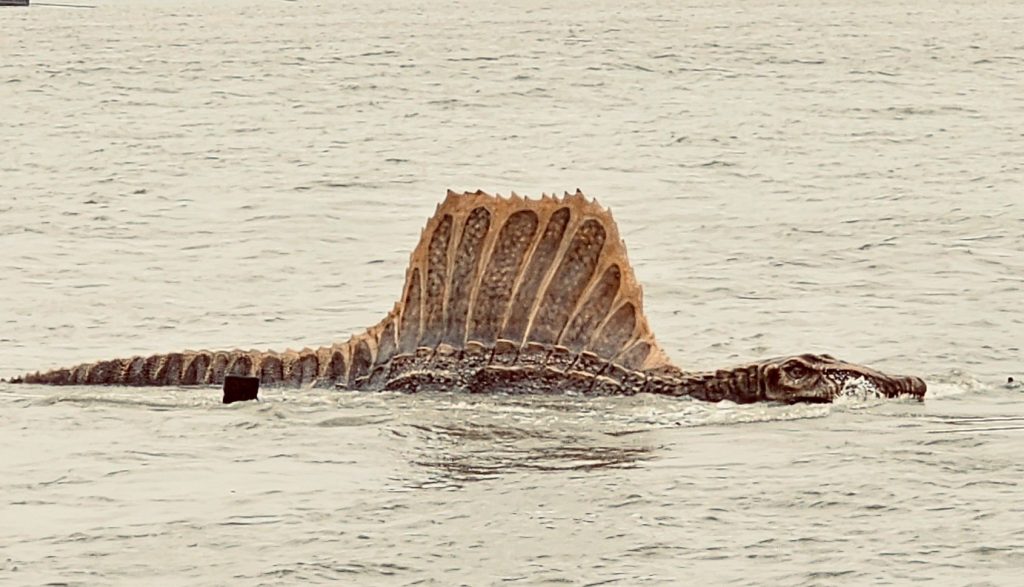 “กระบวนการของเขาคือขึ้นรูปตัวไดโนเสาร์ ส่วนที่เป็นตัวกับกระโดงก็ใช้โฟม ส่วนหางที่ต้องแข็งแรงก็ใช้วัสดุจากยาง ปรากฏว่าเอาไปลองครั้งแรกในบึง มันจมเพราะมันไม่มีอะไรถ่วงดุลน้ำหนัก เผอิญผมนึกได้ว่า ‘ฟองน้ำ’ มันมีคุณสมบัติอุ้มน้ำนี่งั้นลองเอาไปแปะใต้ท้องแพดู ปรากฏว่ามันช่วยให้แพที่ลากไดโนเสาร์ไม่จม แต่พอเรือลากไปมันโผล่เห็นแพลอยขึ้นมาด้วย เลยต้องหาถังเกรอะเติมน้ำถ่วงด้านหน้าแพไว้อีกที ระหว่างโชว์ก็ต้องมีทีมงานสแตนด์บาย ตอนหุ่นจะจมทีมงานต้องใส่เสื้อชูชีพถือมีดคนละเล่มโดดลงไปแก้งาน”