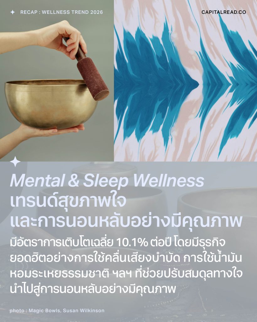 Mental & Sleep Wellness จึงมีอัตราการเติบโตเฉลี่ย 10.1% ต่อปี โดยมีธุรกิจยอดฮิตอย่างกิจกรรม mindfulness การใช้คลื่นเสียงบำบัดหรือ sound healing การใช้ aromatherapy หรือการบำบัดด้วยกลิ่นจากน้ำมันหอมระเหยธรรมชาติ ล้วนช่วยปรับสมดุลทางใจ ผ่อนคลายความเครียด จนนำไปสู่การนอนหลับอย่างมีคุณภาพ พร้อมใช้ชีวิตในวันต่อไปอย่างมีความสุข