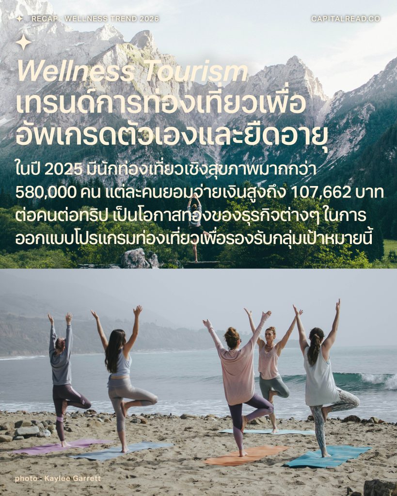 ทุกวันนี้ผู้คนมองหาการท่องเที่ยวที่ทำให้สุขภาพดีขึ้น เพื่ออัพเกรดตัวเองให้เป็นคนที่ดีกว่าเดิมและเดินทางเพื่อยืดอายุ เช่น นั่งสมาธิท่ามกลางธรรมชาติ เข้าคลาสโยคะในรีสอร์ต ทำสปาในบรรยากาศแสนสงบ ทำให้ในปี 2025 มีจำนวนนักท่องเที่ยวเชิงสุขภาพมากกว่า 580,000 คน และแต่ละคนยอมจ่ายเงินในแต่ละทริปสูงถึง 107,662 บาทต่อคนต่อทริป สูงกว่านักท่องเที่ยวทั่วไปถึง 102.67% จึงเป็นโอกาสทองของโรงแรม รีสอร์ต สปา และคลินิกต่างๆ ในการออกแบบโปรแกรมท่องเที่ยวเชิงสุขภาพ เพื่อรองรับกลุ่มเป้าหมายนี้