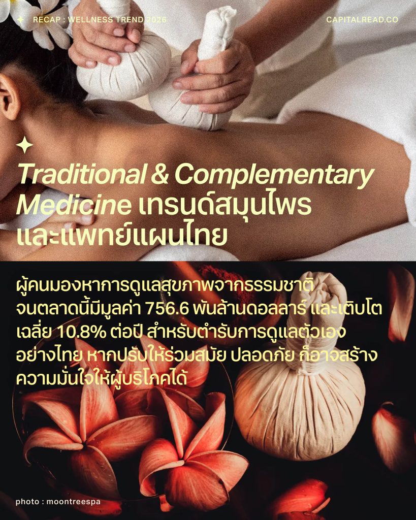 ผู้คนหันมามองหาการดูแลสุขภาพจากธรรมชาติ เพราะเชื่อว่ามีความปลอดภัย และปรับใช้ในชีวิตประจำวันได้ ทำให้สมุนไพรไทยและแพทย์แผนดั้งเดิมได้รับความสนใจในหมู่คนรุ่นใหม่และชาวต่างชาติมากยิ่งขึ้น สอดคล้องกับข้อมูลจาก T&CM คาดว่าตลาดนี้จะมีมูลค่า 756.6 พันล้านดอลลาร์สหรัฐ ในปี 2026 และเติบโตเฉลี่ย 10.8% ต่อปี