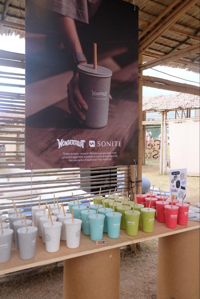 สินค้าหลายชิ้นถูกออกแบบมาให้ใช้งานได้จริง ทั้งระหว่างอยู่ในเทศกาลและนำไปใช้ต่อในชีวิตประจำวัน ตั้งแต่แก้วน้ำและกระติกน้ำที่ชวนให้มองการใช้ชีวิตแบบ zero-waste เป็นเรื่องใกล้ตัว ไม่ว่าจะเป็น Wondercups ที่ร่วมสร้างสรรค์กับแบรนด์ Sonite โดยผลิตจากเปลือกไข่อัพไซเคิล และเลือกใช้สีแทนธาตุทั้งห้าตามแนวคิดแพทย์แผนไทย รวมถึงทัมเบลอร์ KINTO รุ่นพิเศษ